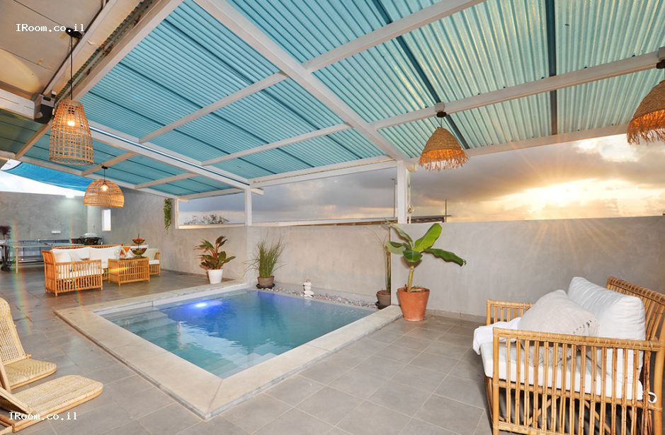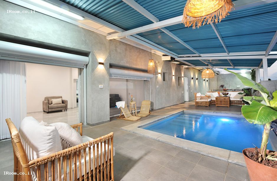 חצר פרטית לחלוטין עם בריכה מחוממת ומקורה בחורף, לצד פינות ישיבה מעוצבות ואווירת חופש.
